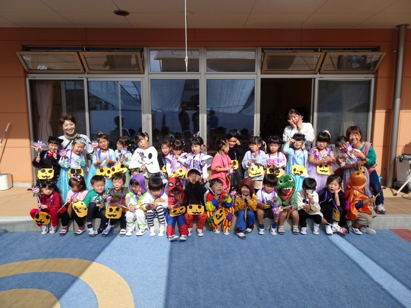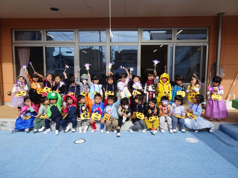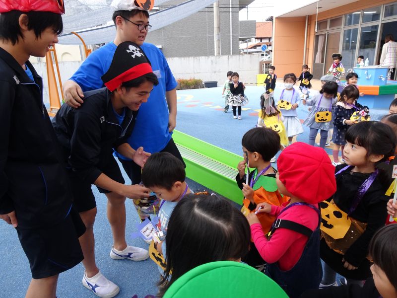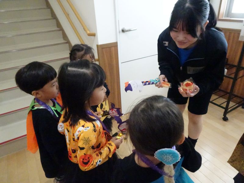 年少組 ハロウィンパーティーをしました🎃 2025.10.30 年少組 年少組で、ハロウィンパーティーをしました🎃✨ 高校生のお兄さん お姉さんにトリック オア トリート!! お菓子を貰ってニコニコのお顔でした💕