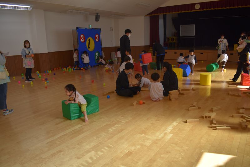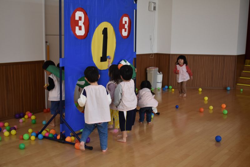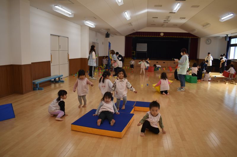 ひよこ組の遊戯室での遊びの様子です。広~いお部屋で、体を思いきり動かして遊んで、楽しかったね!