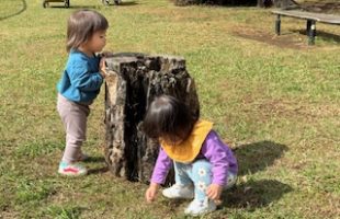 たまご・ぽにょ組の今日のお散歩は、お気に入りの沼津北公園です。木の切り株がとって…