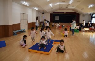 ひよこ組の遊戯室での遊びの様子です。広~いお部屋で、体を思いきり動かして遊んで、…