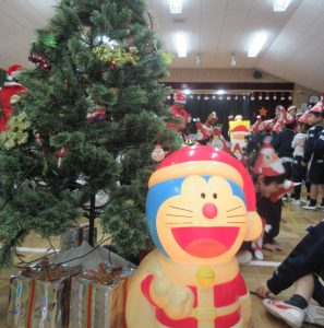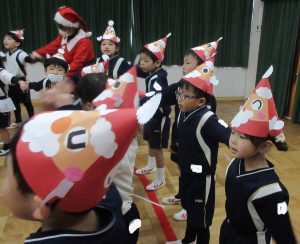サンタさんと一緒にダンスしたり、サンタさんに質問したり…「あれあれ誰かに似てない」「今年のサンタは運転手さん?」いろいろな声が沢山。でもお土産頂くときには、やっぱり「ほんものサンタさんだよ」の声。お昼はお楽しみお弁当でお母さんたちが、素敵なお弁当を作ってくれました。嬉しかったね!デザートは年長組さんが作ってくれたフルーツポンチ美味しかったね。年長さんありがとうね!