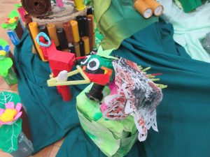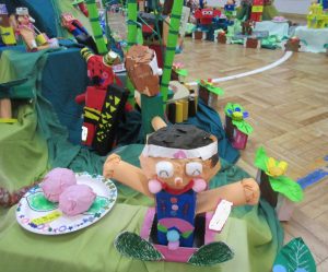 日本昔ばなし「ももたろう」のお話が遊戯室いっぱい作られました。お話に出てくる、ももたろう、犬、猿、きじ、鬼などを廃材を使って思い思いに作りあげたどれも可愛い力作!