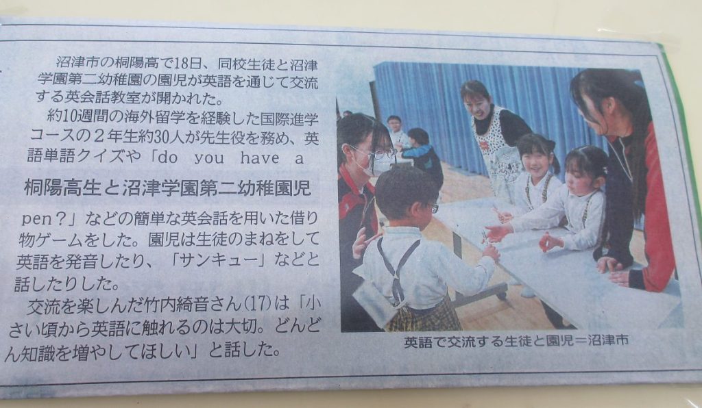 本年度から始まりました沼津学園同法人桐陽高校の国際進学コースの生徒たちとの本年度最後の交流がありました。ゲーム等も英語で楽しみ、充実した時間でした。